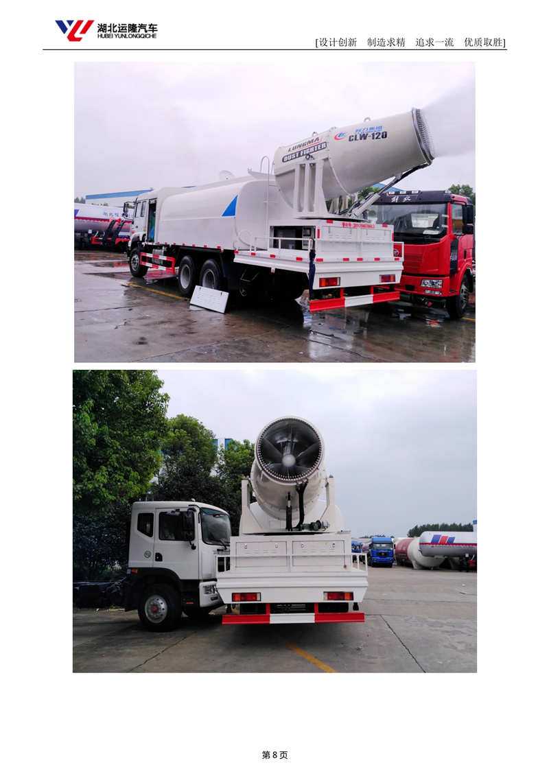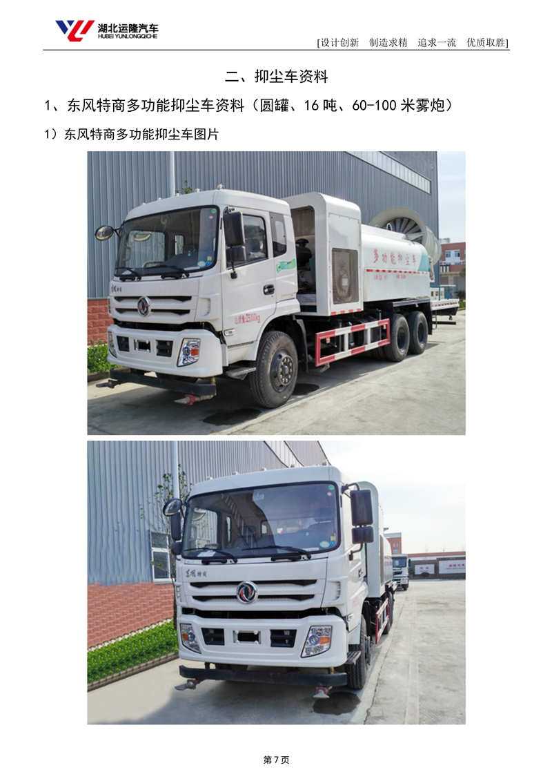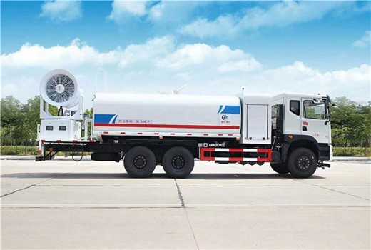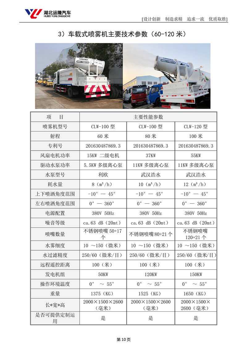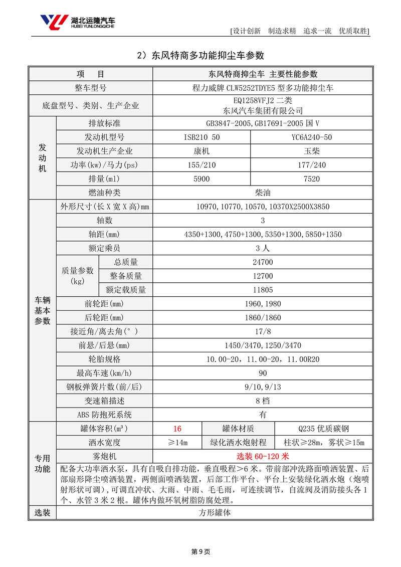 上裝配置:罐體容積為 15-18 立方多功能抑塵灑水車,選配風(fēng)送式霧炮機(jī)組射程50米、60米、80米、100米、120米,罐體鋼板為4mm碳鋼Q235材質(zhì),罐內(nèi)隔板具有防波作用,以減輕汽車行駛時(shí)罐體液體沖擊,罐體及整車外形尺寸按照公告。帶大功率專用灑水泵,泵可自吸自排,整車前沖、后灑、側(cè)噴、帶65消防接口,后平臺(tái)配CLW-50、CLW-60、CLW-80、CLW-100、CLW-120型風(fēng)送式霧炮機(jī)組;罐體前封頭配大功率柴油發(fā)電機(jī)組;遠(yuǎn)程遙控系統(tǒng)控制;霧炮機(jī)自動(dòng)旋轉(zhuǎn)角度0-360°。后平臺(tái)帶綠化灑水炮,灑水炮可全方位旋轉(zhuǎn),可連續(xù)調(diào)成直沖狀、大雨、小雨、毛毛雨;前封頭帶水位計(jì),后平臺(tái)主管路帶1寸澆花接口,后爬梯。帶兩根輸水管及陰陽端。罐體顏色:銀/灰/綠,罐體兩側(cè)噴“多功能抑塵車”字樣,貼反光標(biāo)示。